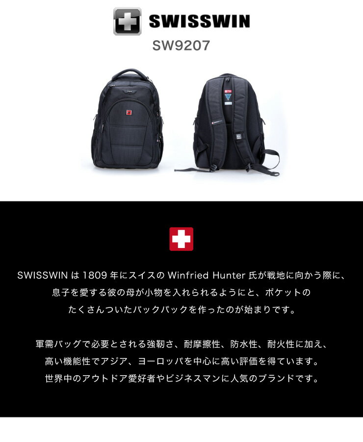SWISSWIN リュックサック ビジネスリュック メンズ SW9207 ブラック 撥水 PC対応 大容量 通勤 出張 旅行JANコード:4589745306111■大容量・多機能 ・軽量・ 防水バッグ■摩擦に強い素材で、耐久性に優れた一品です。