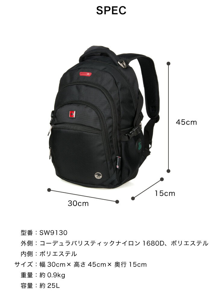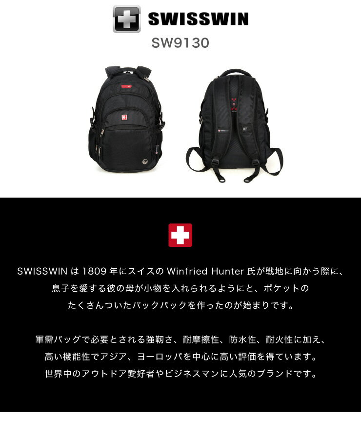 SWISSWIN リュックサック ビジネスリュック メンズ SW9130 ブラック 撥水 PC対応 大容量 通勤 出張 旅行JANコード:4589745307033■15インチPC対応スペース ■摩擦に強い素材で、耐久性に優れた一品です。