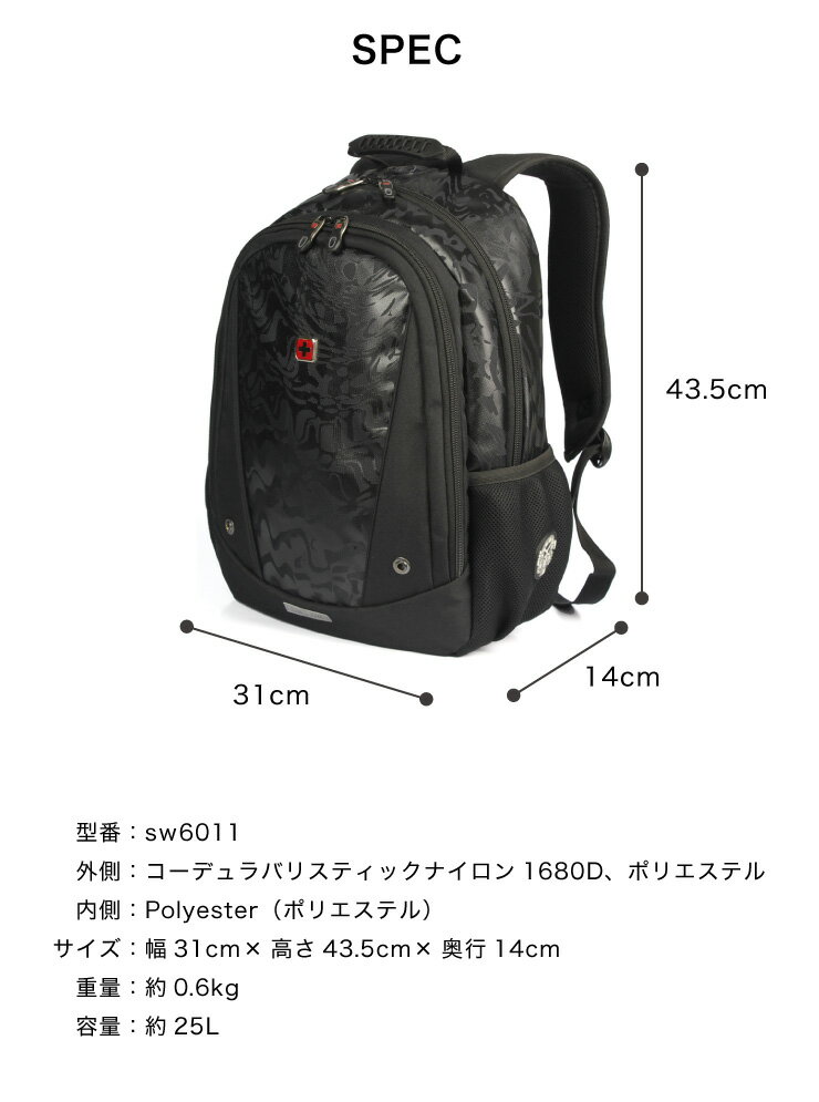 型番:sw6011外側:1680Dナイロンoxford fabric& Polyester(ポリエステル)(撥水加工)内側:Polyester(ポリエステル)サイズ:幅31cm*高さ43.5cm*奥行14cm 重量: 約0.6KG 容量:約25L【送料について】北海道、沖縄、離島は別途送料を頂きます。