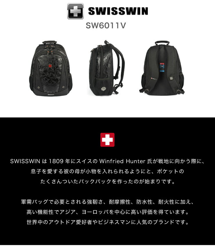SWISSWIN リュックサック ビジネスリュック メンズ SW6011V ブラック 撥水 PC対応 大容量 通勤 出張 旅行JANコード:4589745307361■スタイリッシュに設計された形で、合わせるアイテムを選ばず、多目的に使えるバックパック。